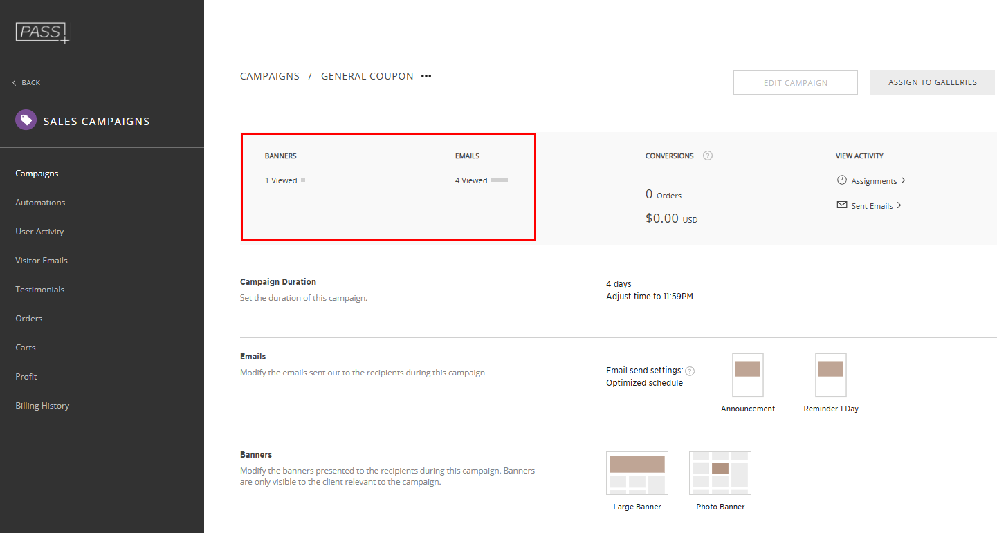 You can also see additional stats such as number of banner views, number of email views, and number of email clicks to view the sale.