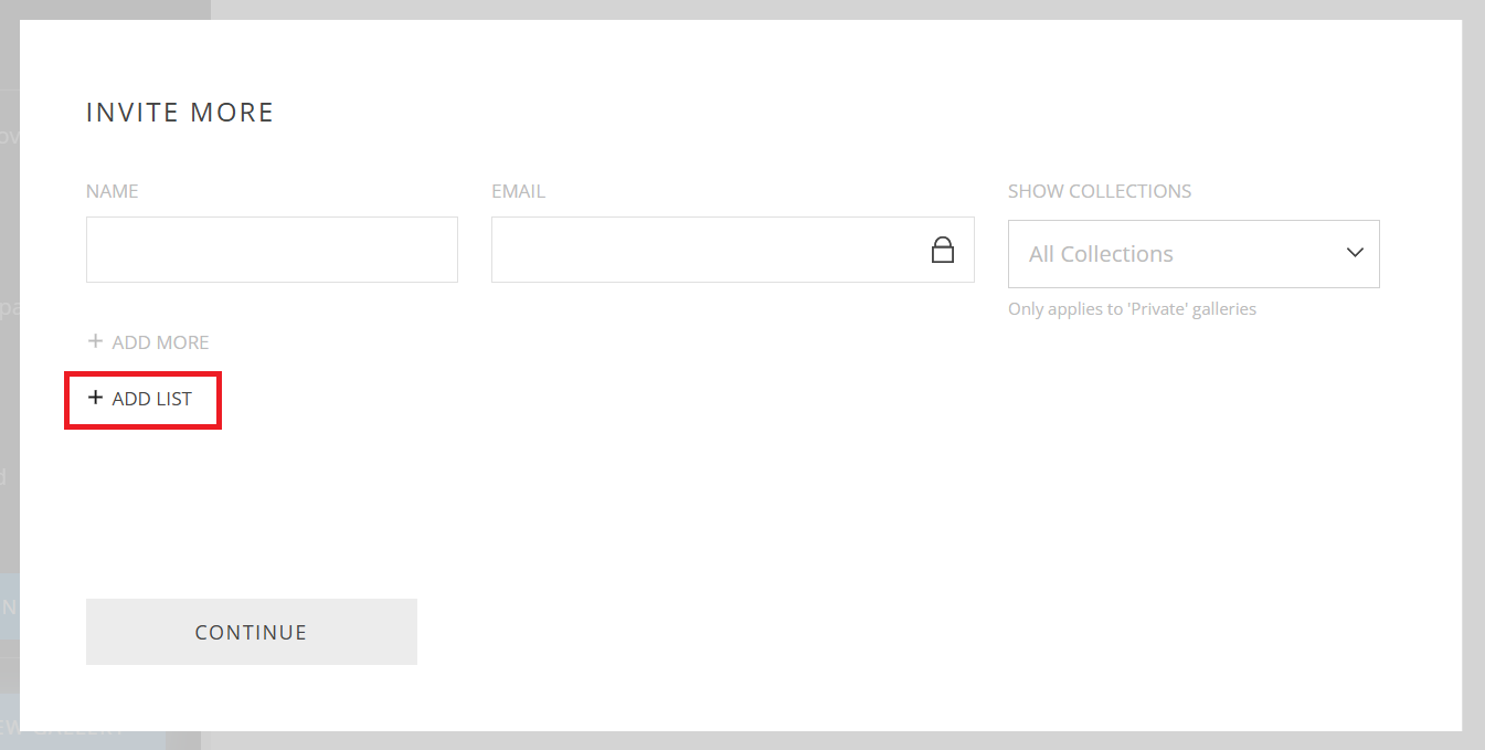 - Open the Share tab in the desired gallery. Under the Invite More People section, click + Invite via Email.