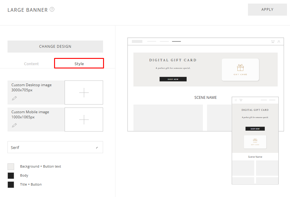 Customize the banner design by uploading desktop and mobile images, selecting fonts, and adjusting colors.