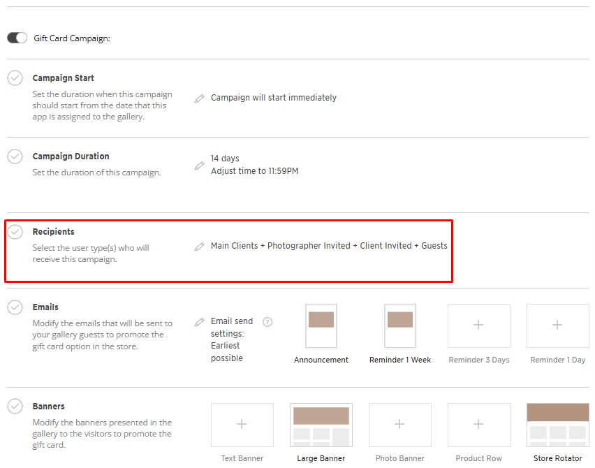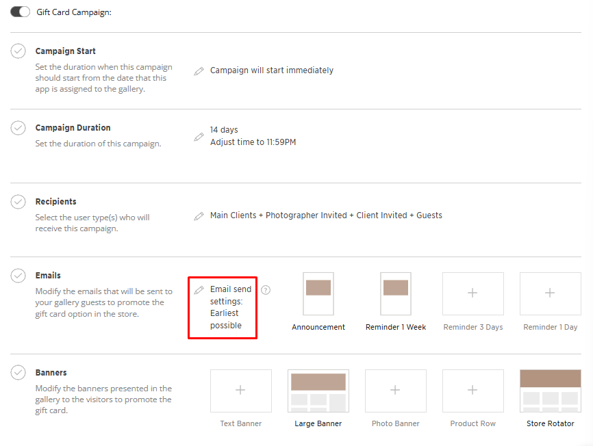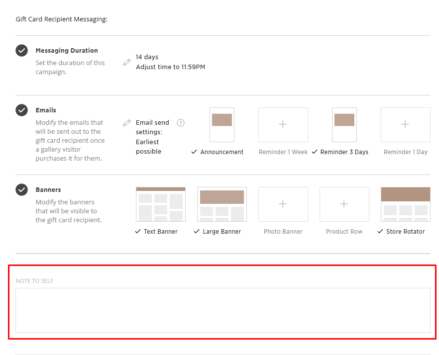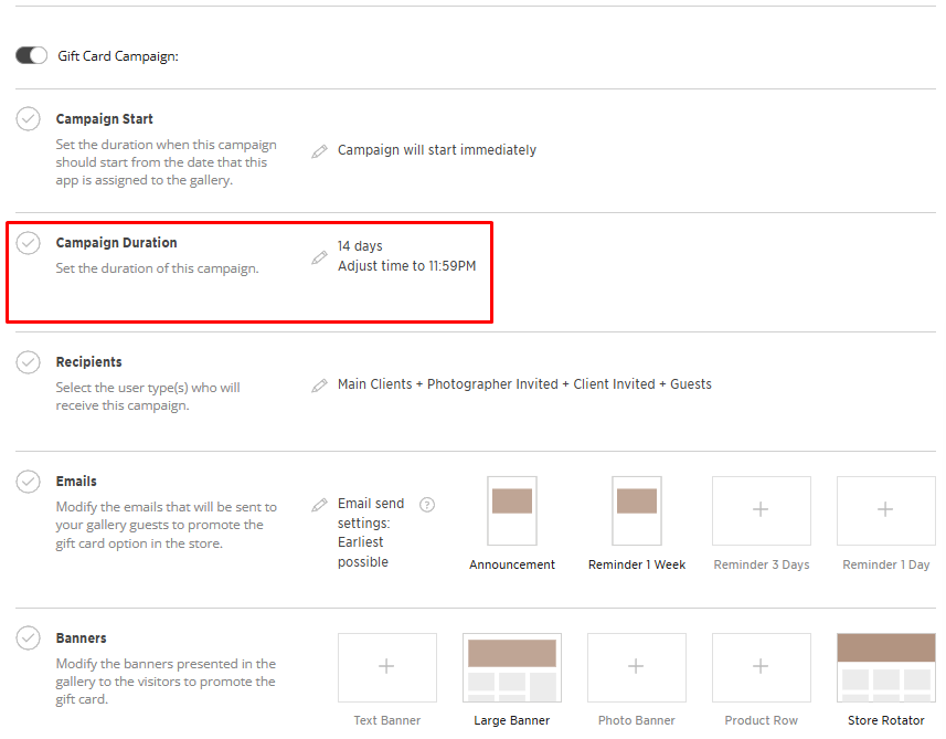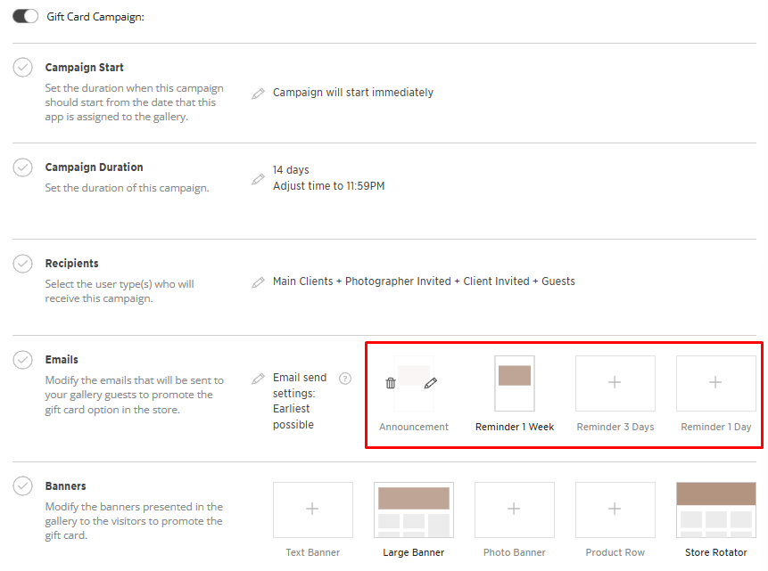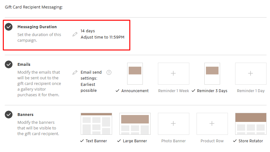 The email announcement will be sent at the beginning of the Messaging Duration, and reminders will go out before the Messaging Duration expires. The banners will display for the whole duration of the campaign and will be seen by the recipient of the gift card only. You can modify the emails and banners the same way you have done previously in the app.