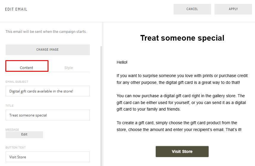 You are now done with building the campaign that would be used to promote the gift card to all gallery visitors! Your gallery visitors can purchase the item in their gallery store and enter the recipient’s email during the purchase process. The recipients will automatically receive emails and banners to announce their new gift card and a code they can use in the cart to redeem their store credit.