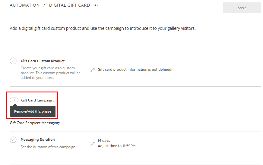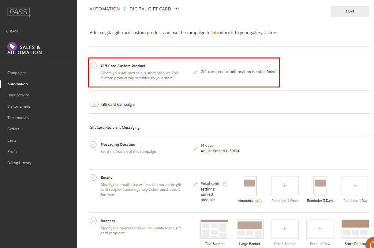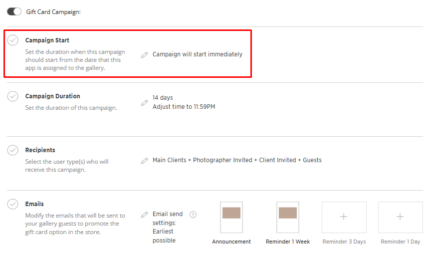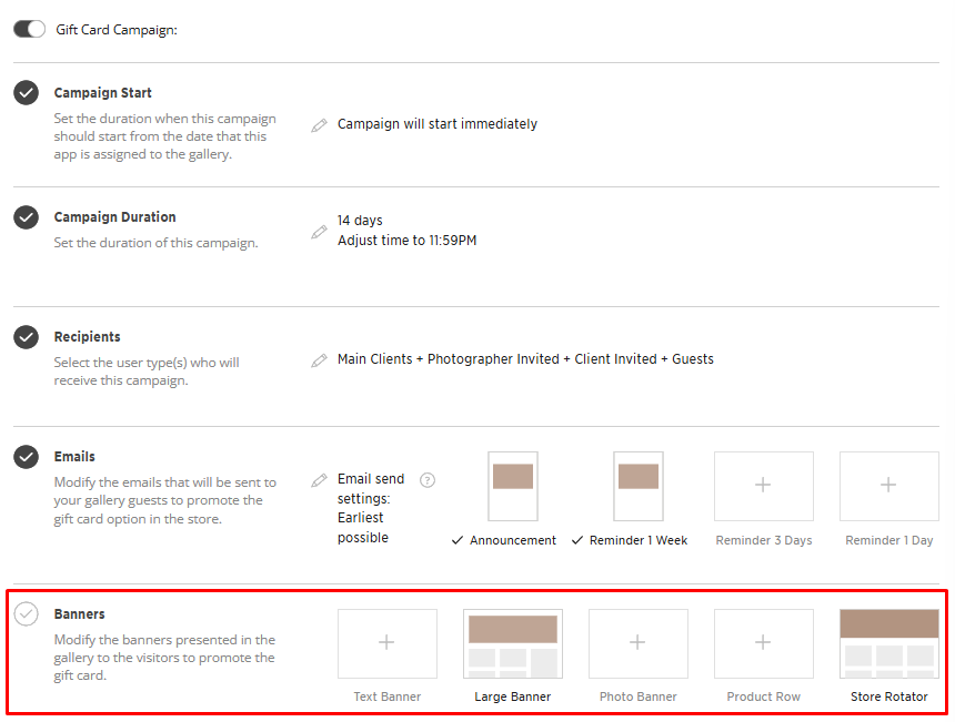 Now you can add a campaign that can be used to promote the new gift card option to your gallery visitors. We recommend installing this app to your Gallery Template, and toggle off this campaign if you have any other campaigns running, making your digital gift card a default store product with every gallery. If you would like to add this campaign, simply toggle it on.