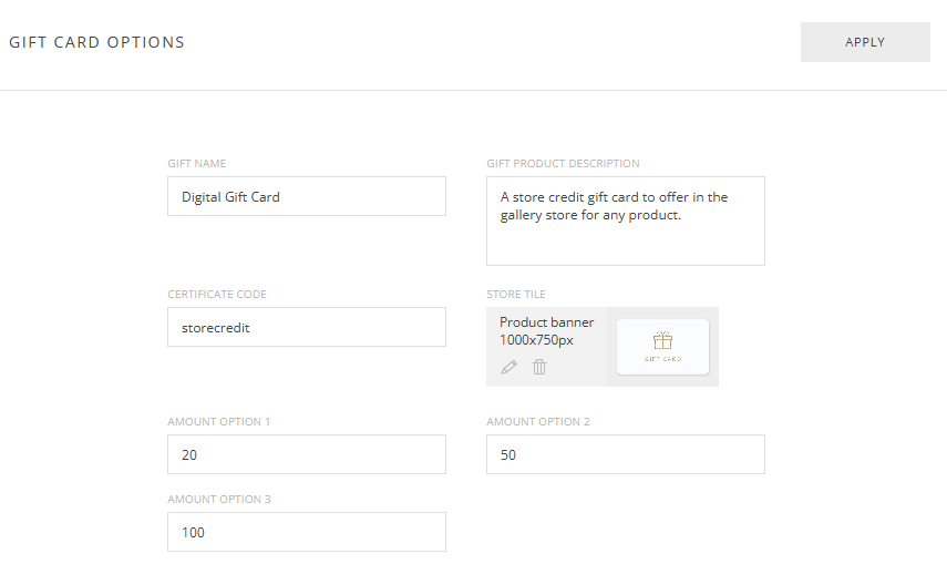 Define the name, description of the gift card, and upload the store tile. Then you can input the amounts you would like to offer for the gift card. Once you click Apply, this item will be added to your store as a custom product, and your gallery visitors will see the item only once the app is assigned to their gallery.